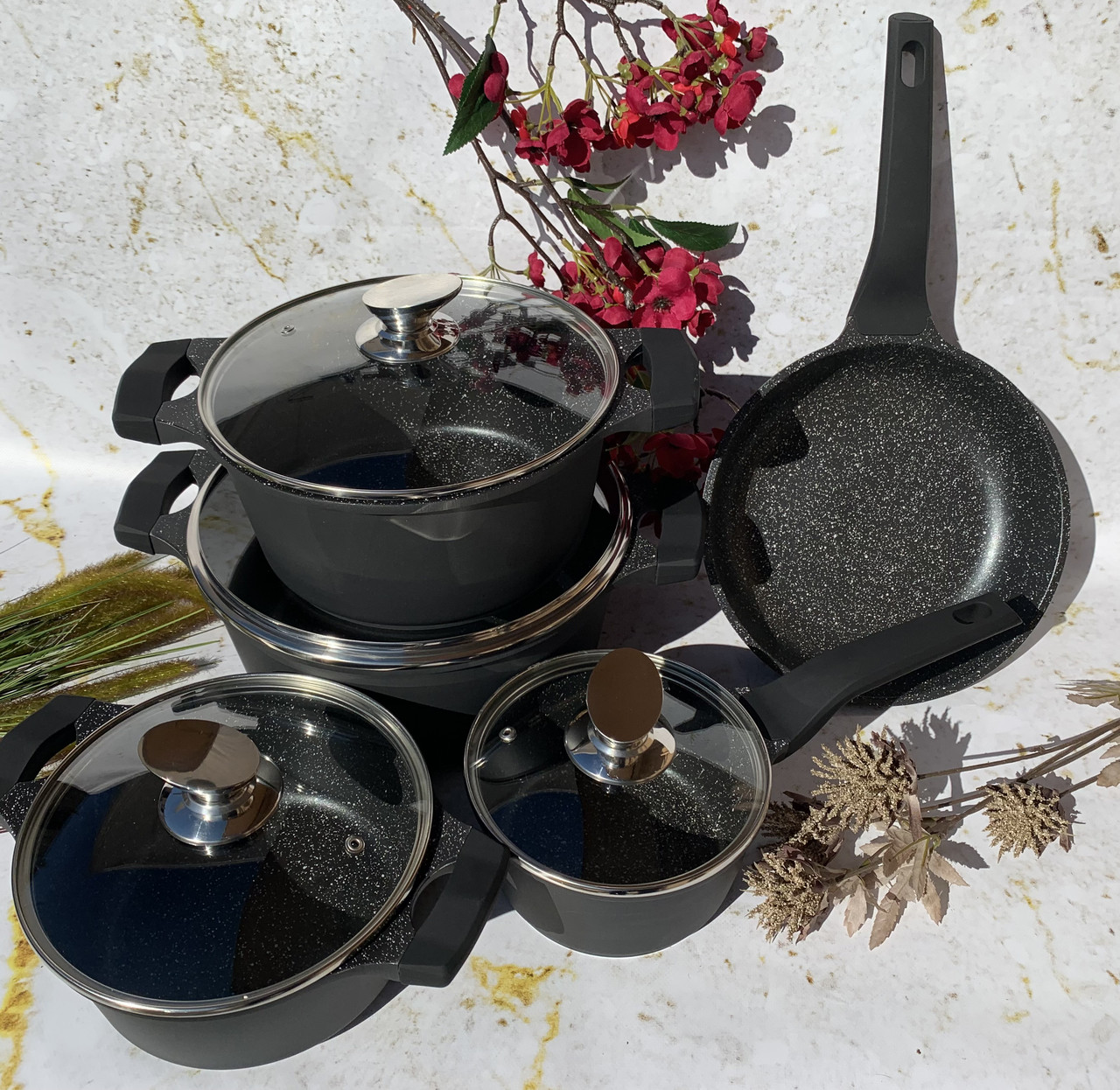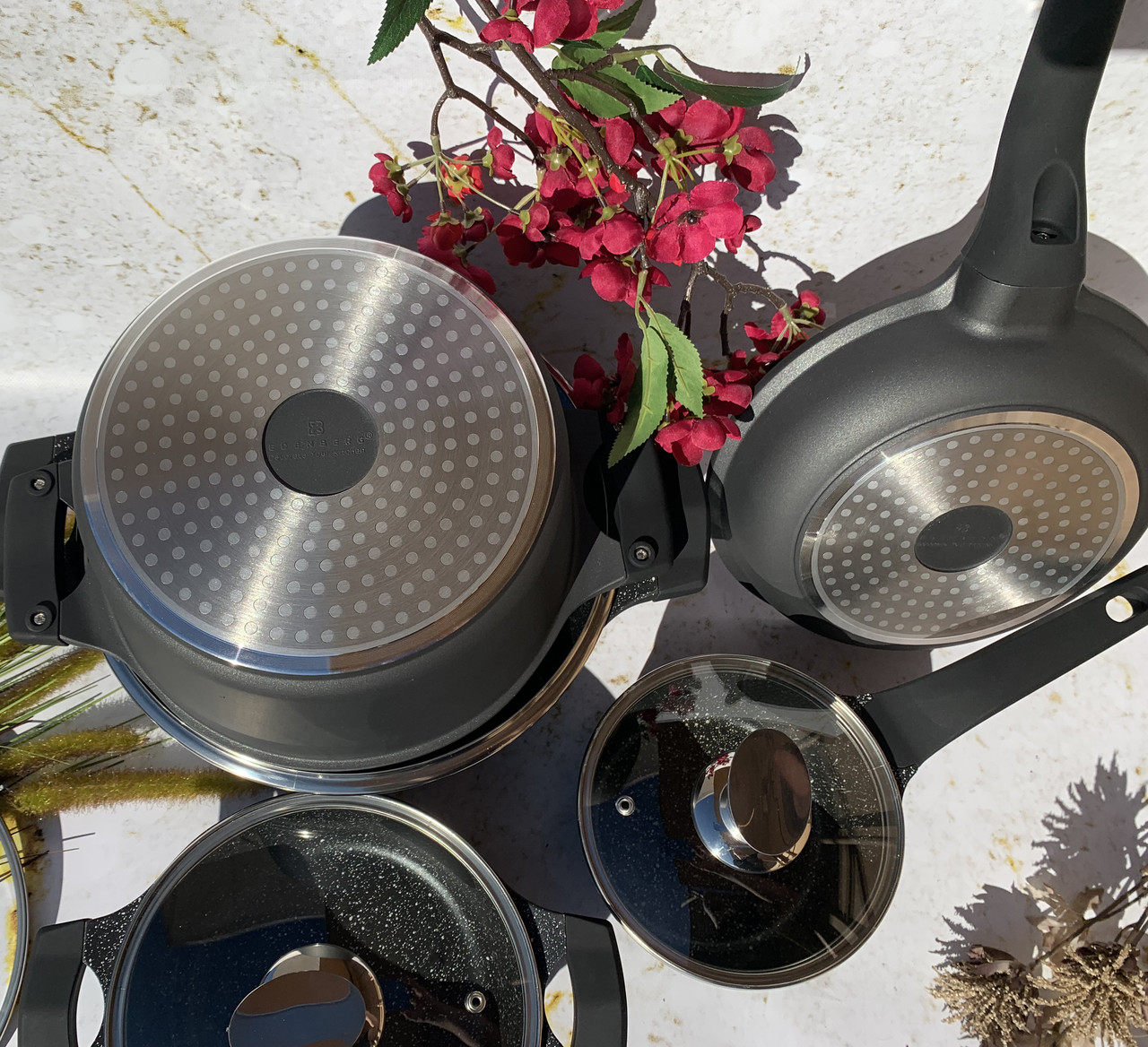 Скляні загартовані кришки з паровідведенням. На кришках обідок із нержавіючої сталі. Весь посуд виготовлений із високоякісного литого алюмінію, 3-х мармурове антипригарне покриття забезпечуючи міцність посуду.